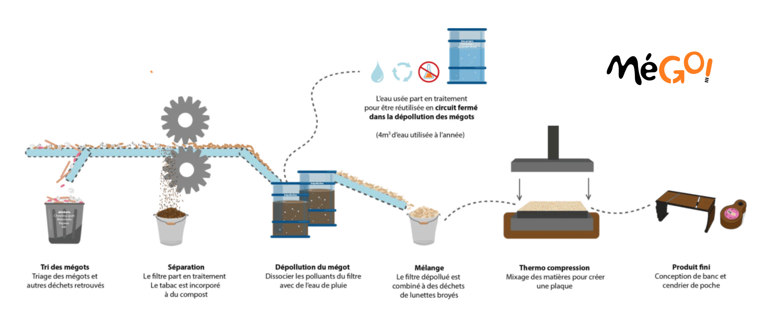 Zum Beispill, fir de MéGO! Recycling ginn nëmme 4m3 Waasser pro Joer benotzt fir Millioune Zigarettenstëmp ze recycléieren.
